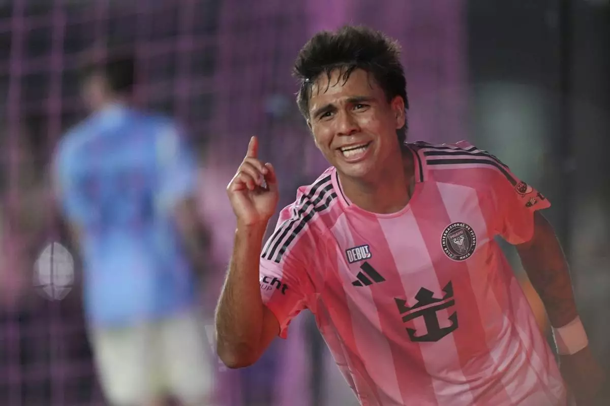 Inter Miami midfielder Telasco Segovia (8) celebrates scoring his side's second goal against New York City FC to tie the game, in the final minutes of stoppage time of an MLS soccer match, Saturday, Feb. 22, 2025, in Fort Lauderdale, Fla. (AP Photo/Rebecca Blackwell)