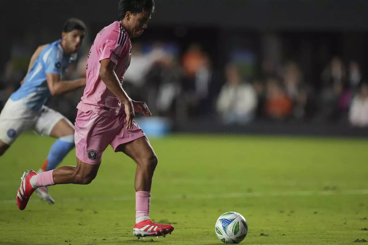 Inter Miami midfielder Telasco Segovia lines up to score his side's second goal against New York City FC, to tie the game in the final minutes of stoppage time of an MLS soccer match, Saturday, Feb. 22, 2025, in Fort Lauderdale, Fla. (AP Photo/Rebecca Blackwell)
