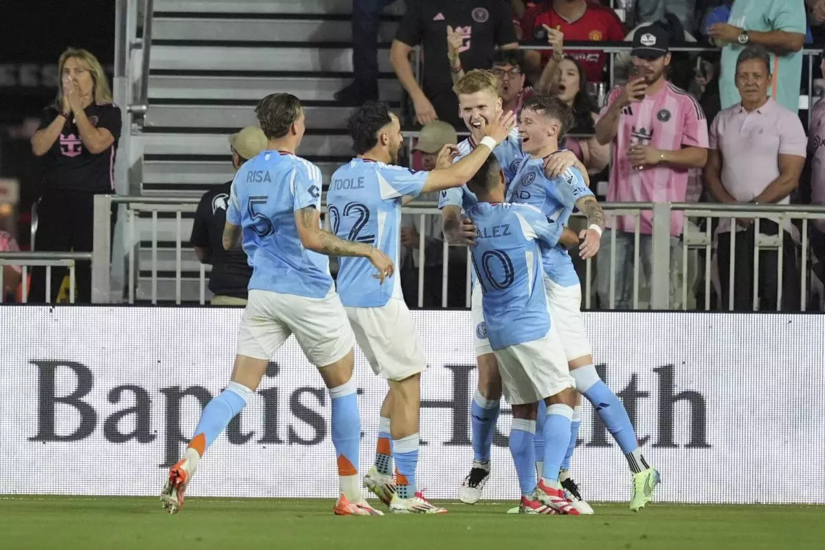 New York City FC players celebrate a goal by New York City FC defender Mitja Ilenic, right, during the first half of an MLS soccer match against Inter Miami, Saturday, Feb. 22, 2025, in Fort Lauderdale, Fla. (AP Photo/Rebecca Blackwell)