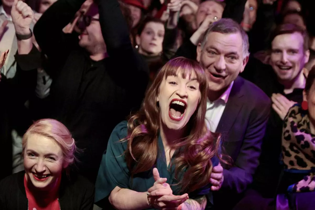 From left, Ines Schwerdtner, co-leader of the Left Party (Die Linke), top candidate Heidi Reichinnek and Jan van Aken, co-leader of the Left Party (Die Linke) react during the party's election party in Berlin, Germany, Sunday, Feb. 23, 2025. (Carsten Koall/dpa via AP)