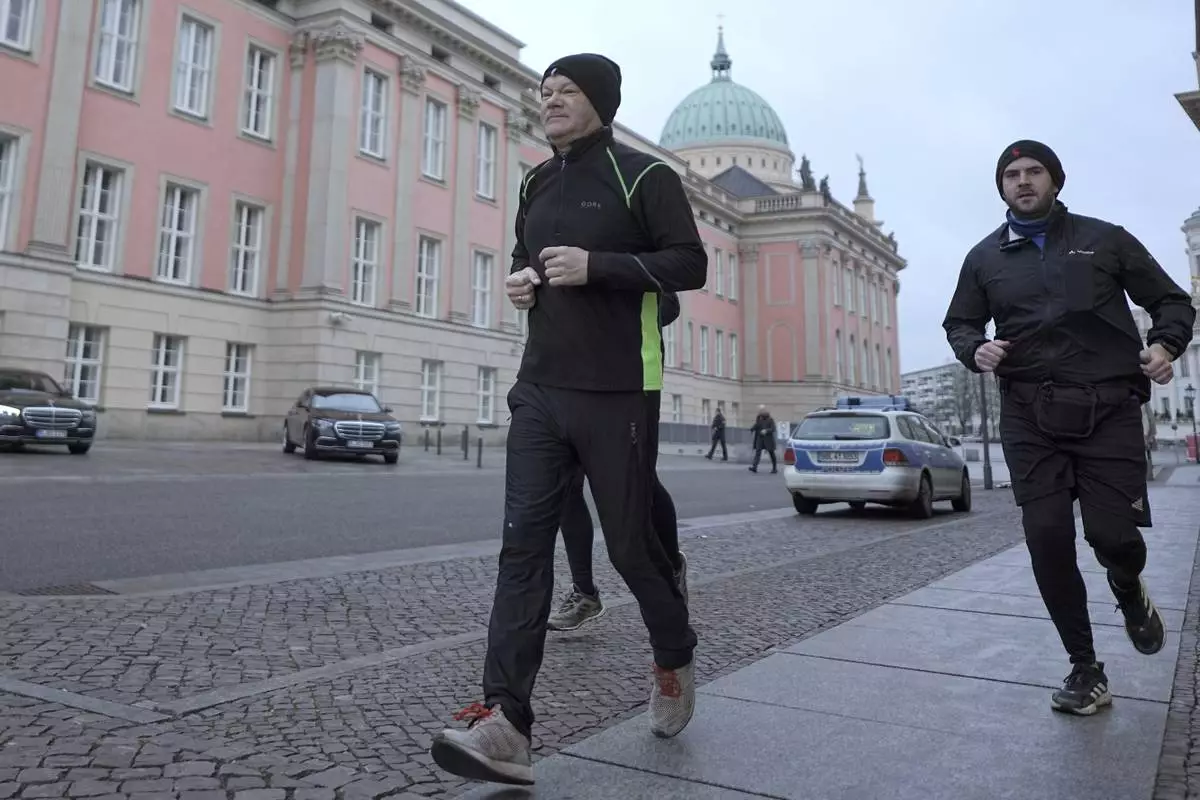 German Chancellor Olaf Scholz, left, jogs in the early morning accompanied by a bodyguard in Potsdam, Germany, Sunday, Feb. 23, 2025. (Michael Kappeler/dpa via AP)