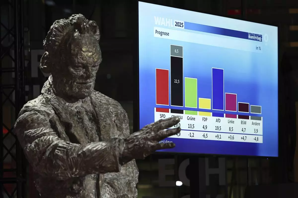The Willy Brandt sculpture can be seen next to a screen with the election forecasts at the headquarters of the German Social Democratic party (SPD) in Berlin, Germany, Sunday, Feb. 23, 2025, during the national election. (Hannes P Albert/dpa via AP)