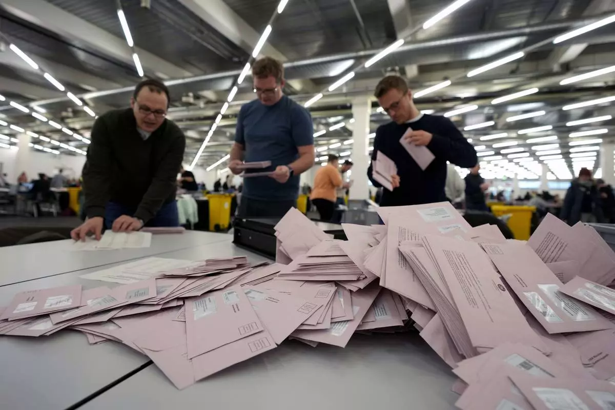 Volunteers prepare postal votes during the German national election in Munich, Germany, Sunday, Feb. 23, 2025. (AP Photo/Matthias Schrader)