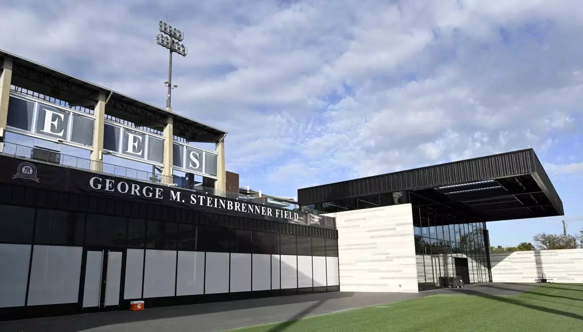 A recently completed wing of the New York Yankees clubhouse lines the first base side of the stadium during a tour of the upgraded team spring training facilities Thursday, Feb. 13, 2025, at George M. Steinbrenner Field in Tampa, Fla. (AP Photo/Steve Nesius)