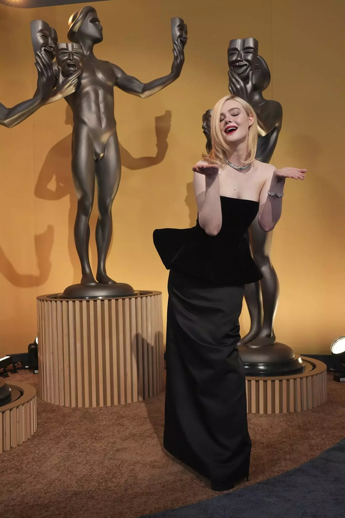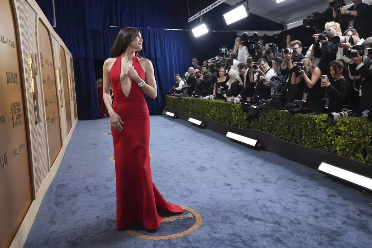 Elle Fanning arrives at the 31st annual Screen Actors Guild Awards on Sunday, Feb. 23, 2025, at the Shrine Auditorium in Los Angeles. (AP Photo/Chris Pizzello)