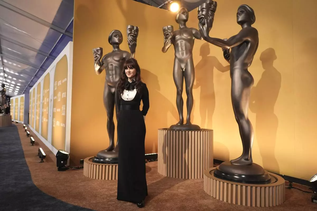 Zooey Deschanel arrives at the 31st annual Screen Actors Guild Awards on Sunday, Feb. 23, 2025, at the Shrine Auditorium in Los Angeles. (AP Photo/Chris Pizzello)