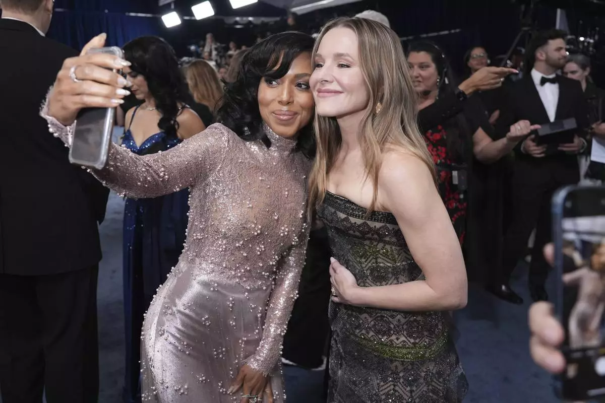 Kerry Washington, left, and Kristen Bell take a selfie photograph at the 31st annual Screen Actors Guild Awards on Sunday, Feb. 23, 2025, at the Shrine Auditorium in Los Angeles. (AP Photo/Chris Pizzello)