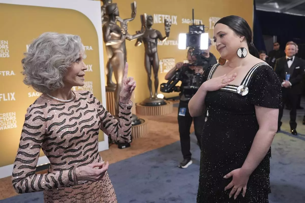 Lily Gladstone, left, and Jane Fonda arrive at the 31st annual Screen Actors Guild Awards on Sunday, Feb. 23, 2025, at the Shrine Auditorium in Los Angeles. (AP Photo/Chris Pizzello)