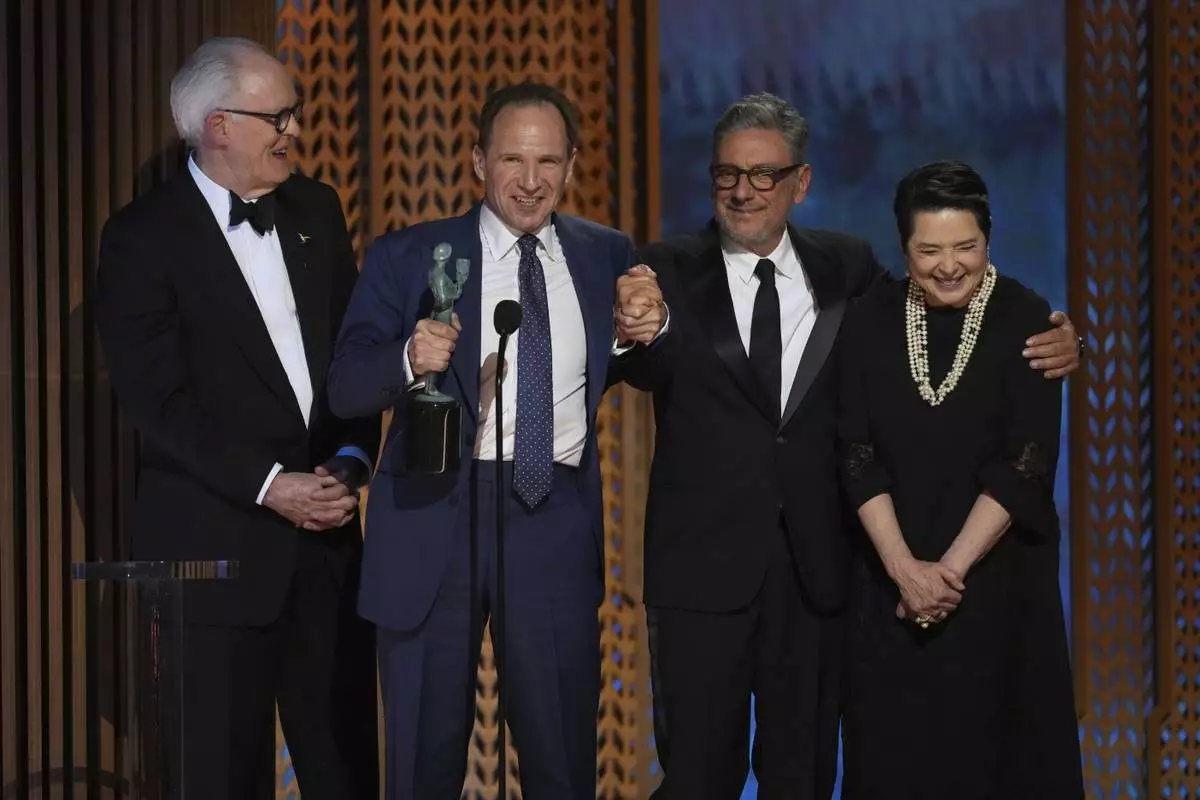John Lithgow, from left, Ralph Fiennes, Sergio Castellitto, and Isabella Rossellini accepts the award for outstanding performance by a cast in a motion picture for "Conclave" during the 31st annual Screen Actors Guild Awards on Sunday, Feb. 23, 2025, at the Shrine Auditorium in Los Angeles. (AP Photo/Chris Pizzello)