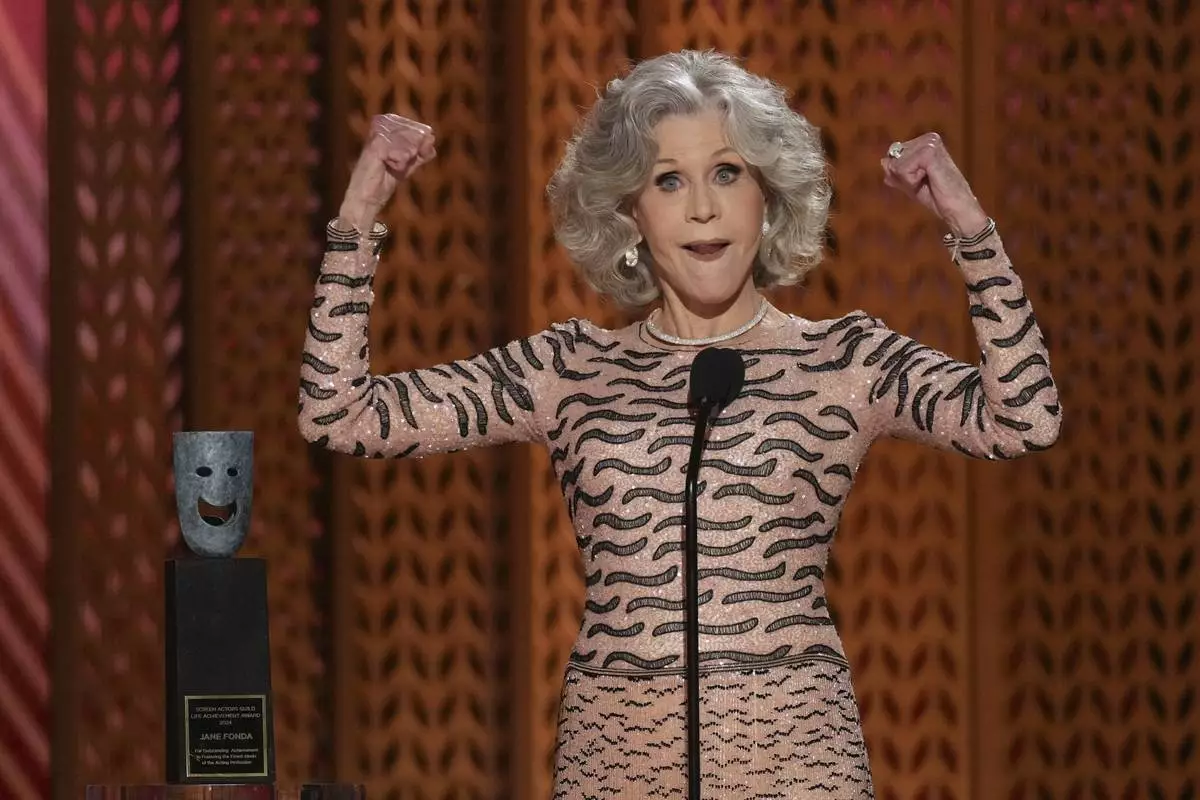 Jane Fonda accepts the lifetime achievement award during the 31st annual Screen Actors Guild Awards on Sunday, Feb. 23, 2025, at the Shrine Auditorium in Los Angeles. (AP Photo/Chris Pizzello)