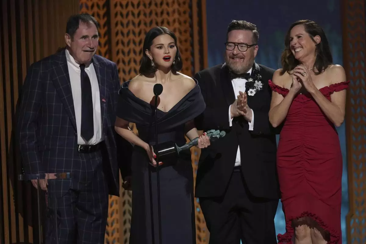 Richard Kind, from left, Selena Gomez, Michael Cyril Creighton, and Molly Shannon accept the award for outstanding performance by an ensemble in a comedy series for "Only Murders In The Building" during the 31st annual Screen Actors Guild Awards on Sunday, Feb. 23, 2025, at the Shrine Auditorium in Los Angeles. (AP Photo/Chris Pizzello)