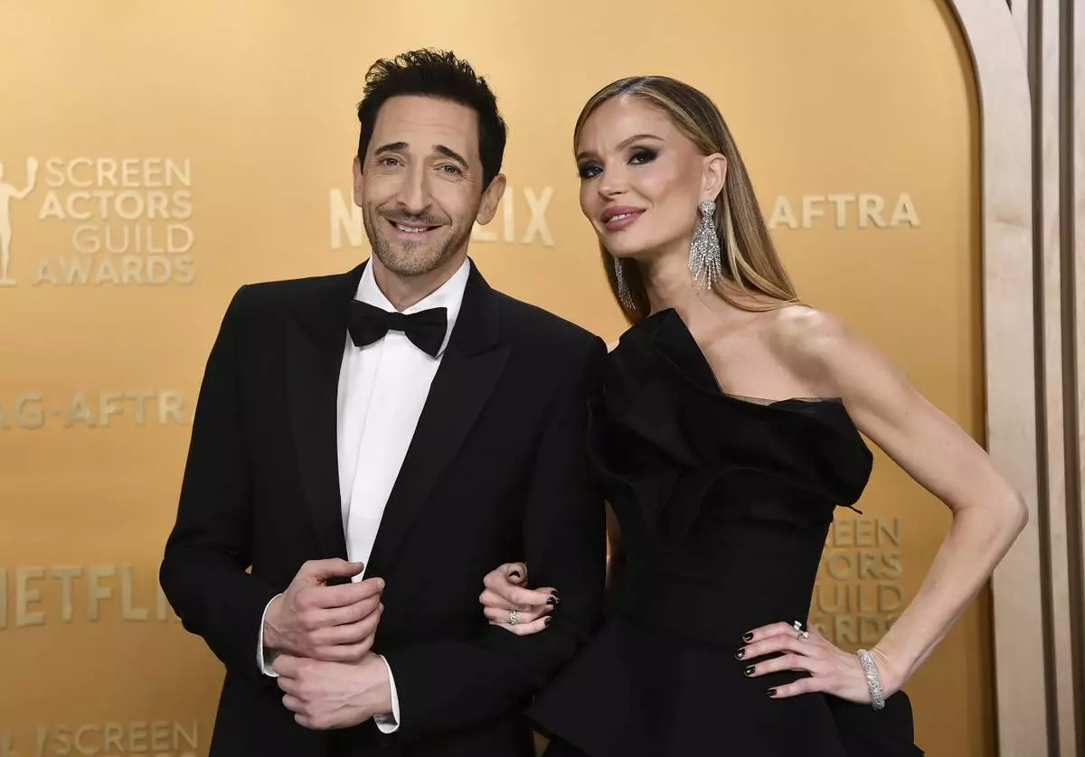 Adrien Brody, left, and Georgina Chapman arrive at the 31st annual Screen Actors Guild Awards on Sunday, Feb. 23, 2025, at the Shrine Auditorium in Los Angeles. (Photo by Richard Shotwell/Invision/AP)