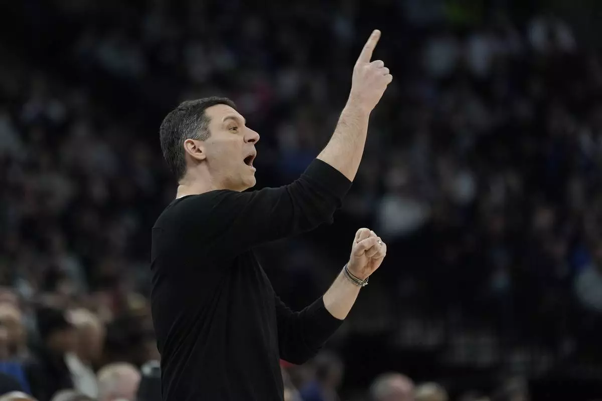 Oklahoma City Thunder head coach Mark Daigneault yells during the first half of an NBA basketball game against the Minnesota Timberwolves, Sunday, Feb. 23, 2025, in Minneapolis. (AP Photo/Abbie Parr)