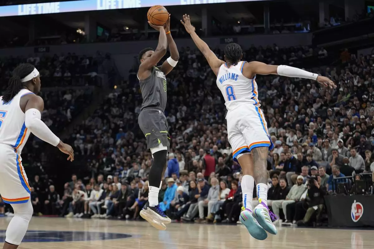 After the Thunder went up 52-33 by making 19 of their first 27 shots, the Timberwolves had a 25-4 run over a 6:07 stretch. With Holmgren on him at the top of the key, Edwards used a crossover dribble and a slight step-back for his first made 3-pointer of the game with 2:36 left in the second quarter.