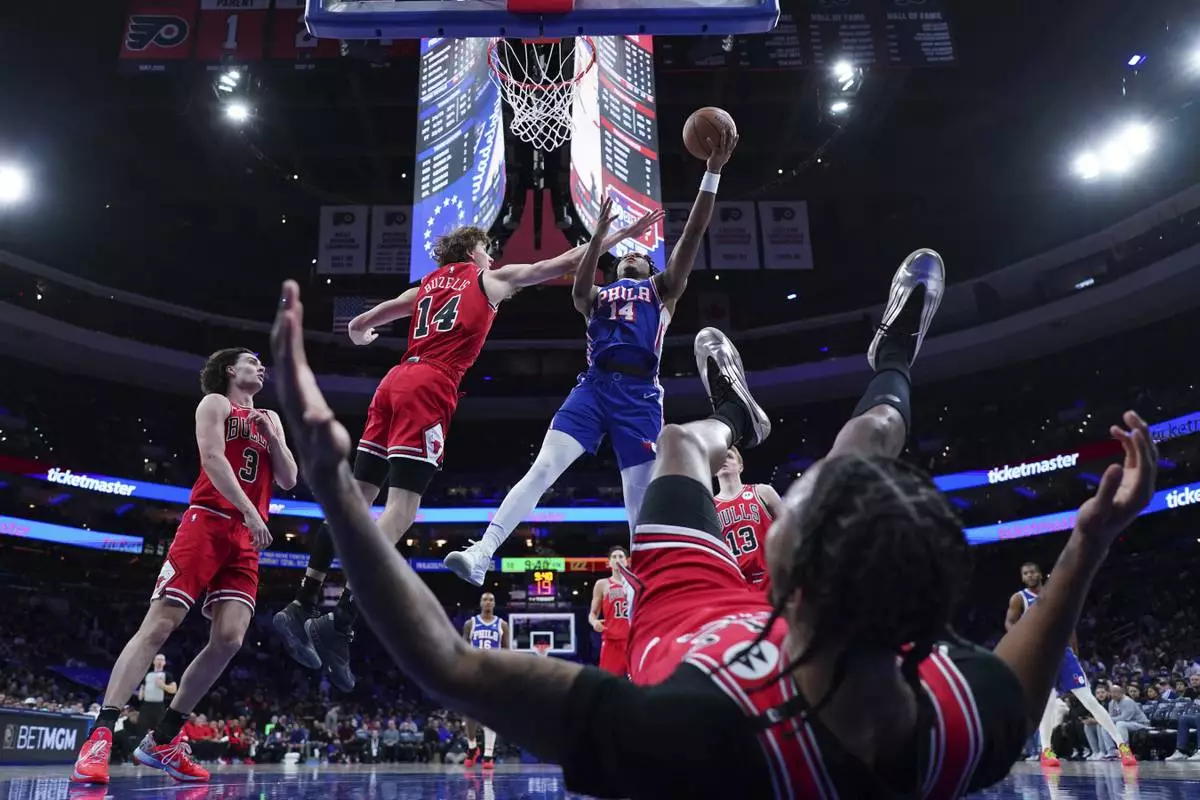Philadelphia 76ers' Ricky Council IV, right, goes up for a shot against Chicago Bulls' Matas Buzelis during the second half of an NBA basketball game Monday, Feb. 24, 2025, in Philadelphia. (AP Photo/Matt Slocum)