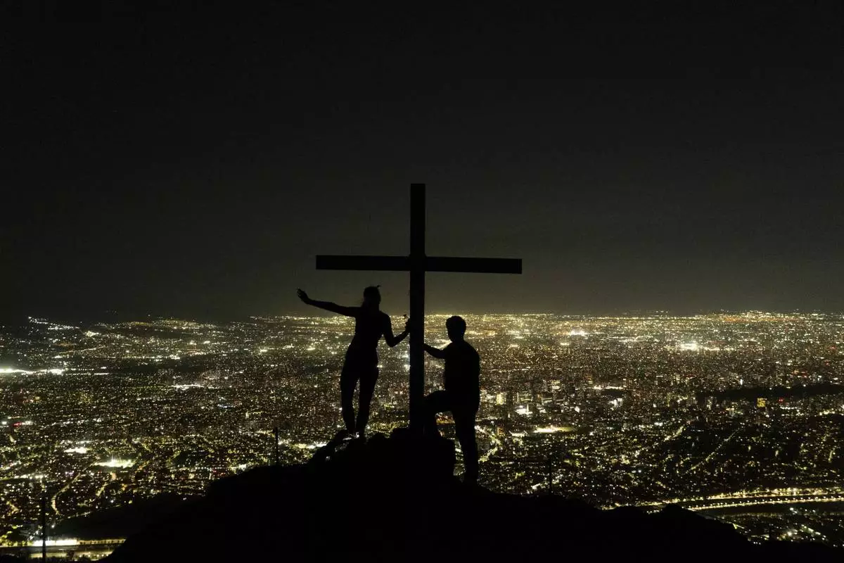 People stand atop of Manquehuito hill in Santiago, Chile, Monday, Feb. 24, 2025. (AP Photo/Matias Basualdo)