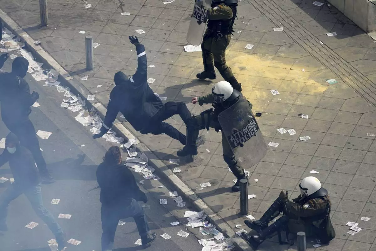 Protesters clash with Riots police outside from the parliament during a rally in central Athens, Greece to mark two years since a deadly rail disaster that has also triggered hundreds of other demonstrations and a general strike, on Friday, Feb. 28, 2025. (AP Photo/Thanassis Stavrakis)