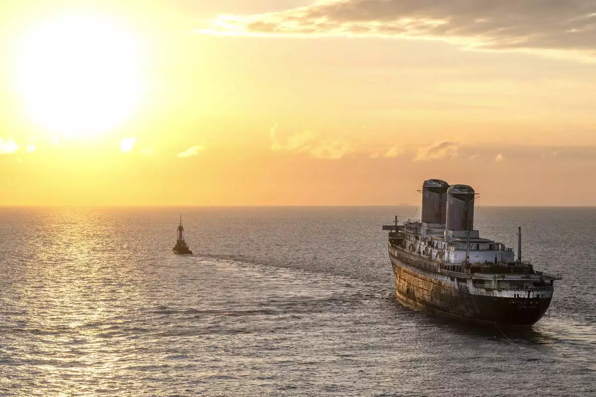 The SS United States is towed at sunset past Key West, Fla., headed to Mobile, Ala., Thursday, Feb. 27, 2025, where it will be prepared to be used as an artificial reef. (Rob O'Neal/The Key West Citizen via AP)