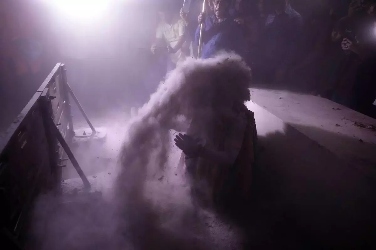 A Hindu holy man bathes with ash at crematorium in Jhulasan village of Mehsana district of Gujarat state on Shivratri festival, India, Wednesday, Feb. 26, 2025. (AP Photo/Ajit Solanki)