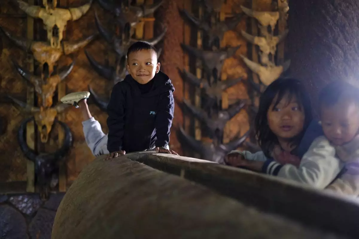 Children play by a traditional log drum in the house of the Angh, or chief, at Longwa village on the India-Myanmar border in the northeastern India state of Nagaland, Thursday, Dec.12, 2024. (AP Photo/Yirmiyan Arthur)