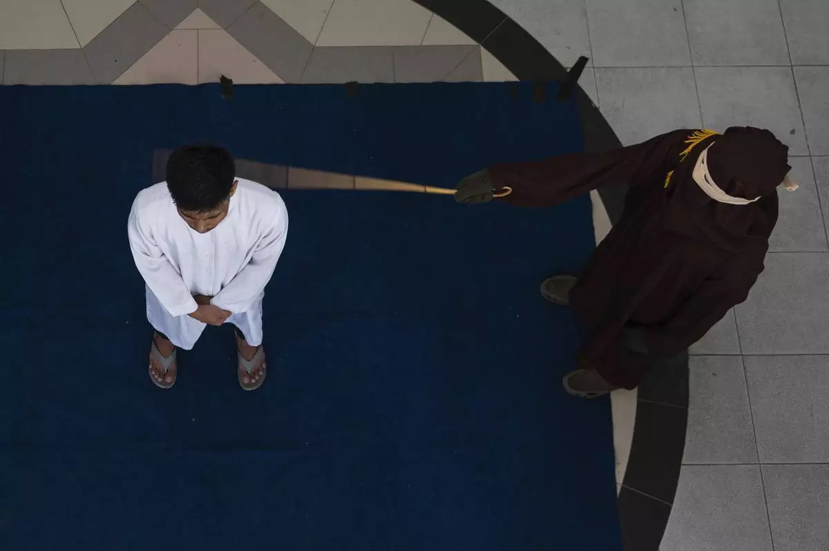 A Shariah law official uses a rattan cane to whip one of two men convicted of gay sex in Banda Aceh, Aceh province, Indonesia, Thursday, Feb. 27, 2025.(AP Photo/ Reza Saifullah)