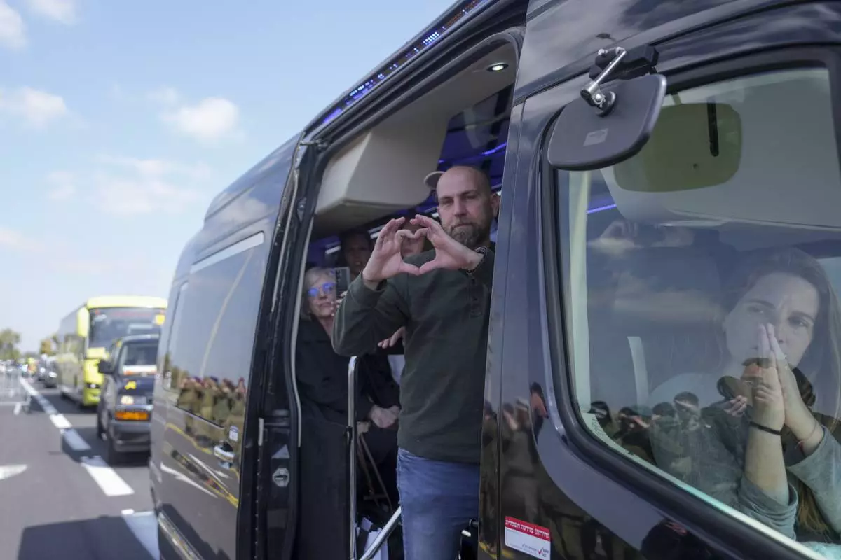 Relatives of the Bibas family show their appreciation to crowds along the road leading to the funeral of slain hostages Shiri Bibas and her two children, Ariel and Kfir, near Kibbutz Nir Oz, southern Israel, Wednesday, Feb. 26, 2025. The mother and her two children were abducted by Hamas on Oct. 7, 2023, and their remains were returned from Gaza to Israel last week as part of a ceasefire agreement with Hamas. (AP Photo/Ohad Zwigenberg)