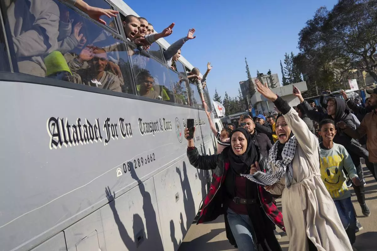 Freed Palestinian prisoners react as they arrive in the Gaza Strip after being released from an Israeli prison following a ceasefire agreement between Hamas and Israel in Khan Younis, Gaza Strip, Thursday, Feb. 27, 2025. (AP Photo/Jehad Alshrafi)