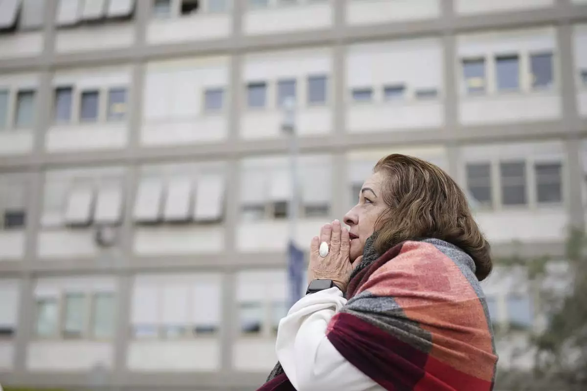A woman prays at the Agostino Gemelli Polyclinic, in Rome, Monday, Feb. 24, 2025 where Pope Francis is hospitalized since Friday, Feb. 14. (AP Photo/Alessandra Tarantino)