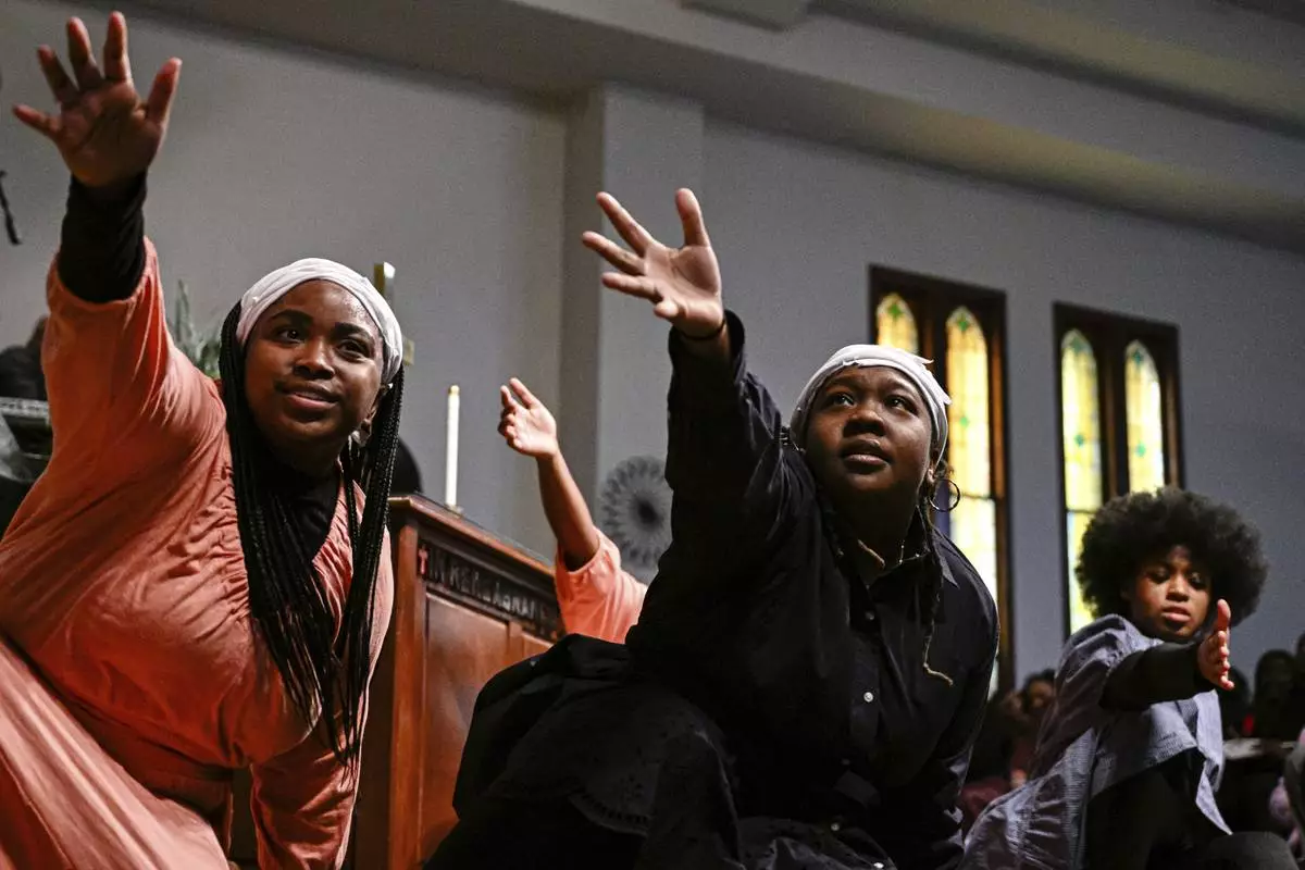 A dance team performs an interpretive dance during the annual Black History Month event, Lift Every Voice, presented by Women in Worship of Lexington at Consolidated Baptist Church in Lexington, Ky., Sunday, Feb. 23, 2025. (AP Photo/Jon Cherry)