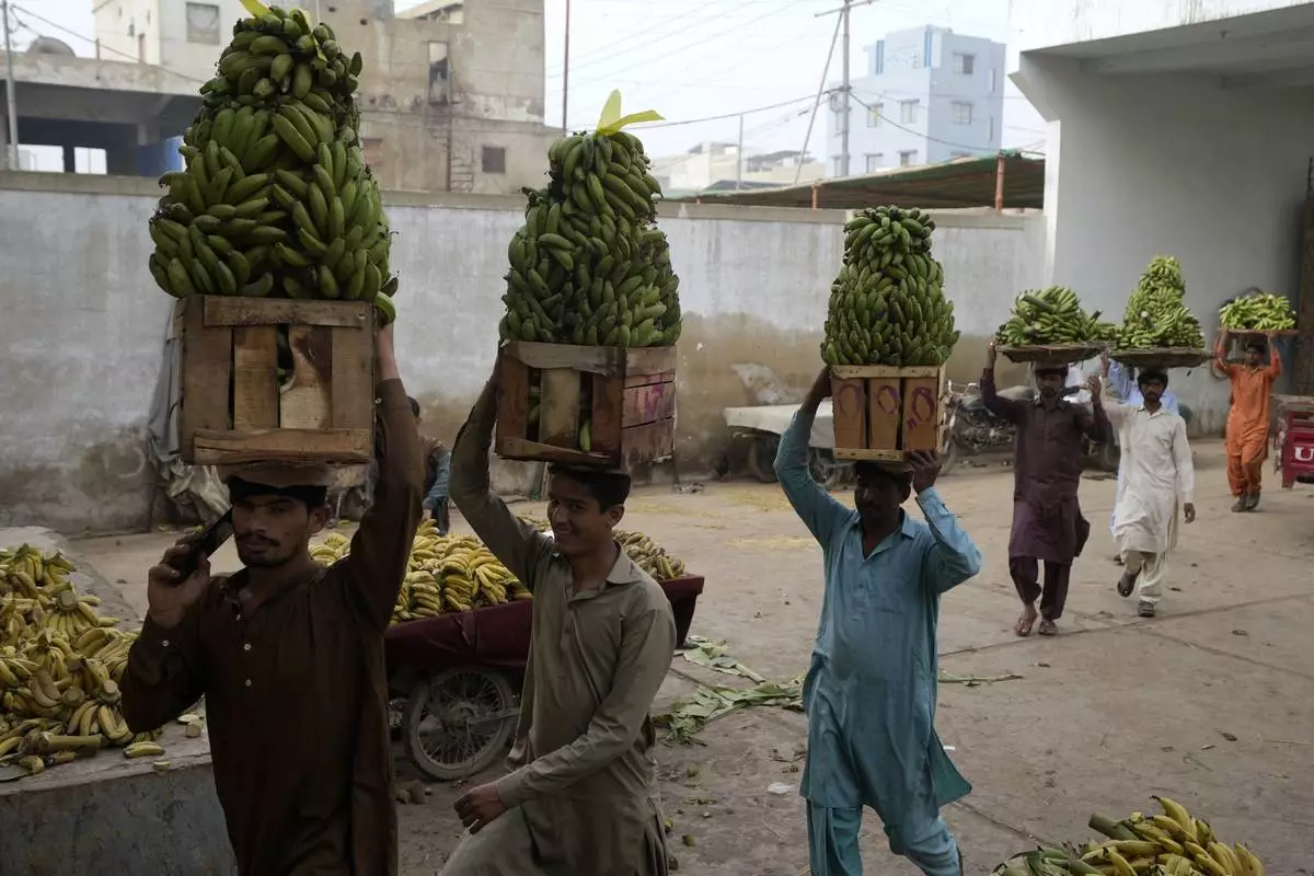 Workers carry bunches of bananas to be auctioned at a wholesale fruit market, in Karachi, Pakistan, Wednesday, Feb. 26, 2025. (AP Photo/Fareed Khan)
