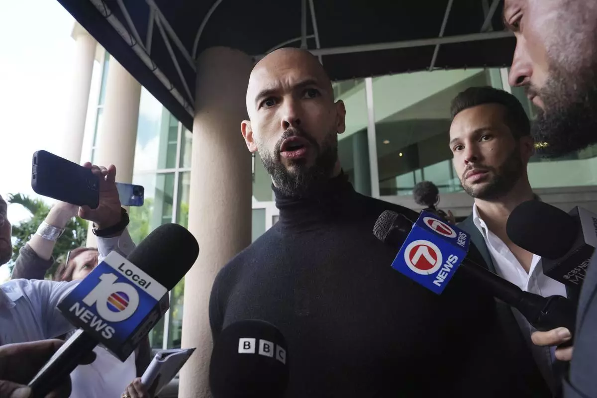 Influencer brothers Andrew and Tristan Tate arrive, Thursday, Feb. 27, 2025, in Fort Lauderdale, Fla. The brothers were charged with human trafficking in Romania and arrived in the U.S. after authorities lifted travel restrictions. (AP Photo/Marta Lavandier)