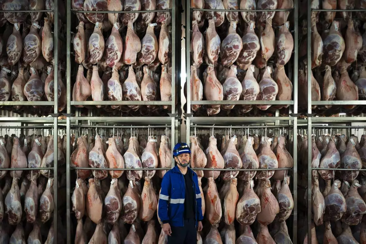 Víctor Razuri, 41, from Peru, poses in a ham drying plant in Guissona, Lleida, Spain, Thursday, Feb. 20, 2025. Inside a cavernous production plant in northeastern Spain, among millions of legs of Spanish ham traveling down hooks and conveyer belts, people from 62 nationalities work side by side to keep a successful food company humming. (AP Photo/Joan Mateu Parra)