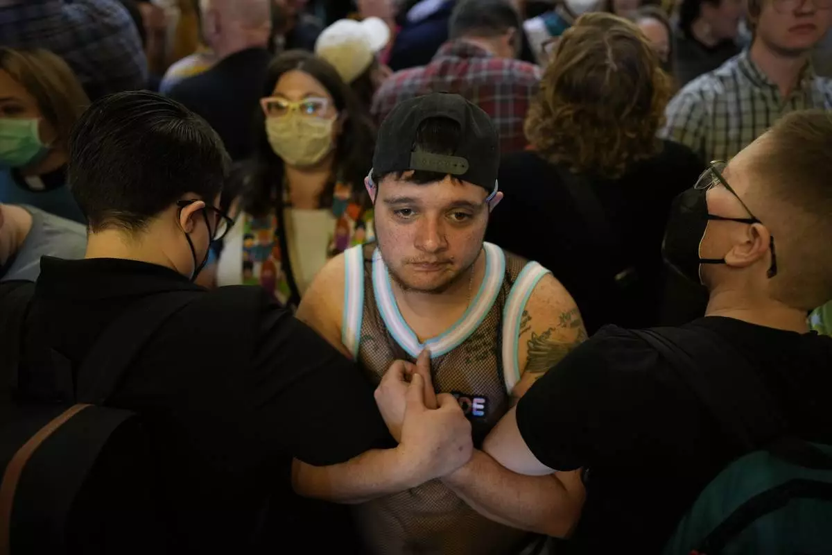 Protesters fill the Iowa state Capitol to denounce a bill that would strip the state civil rights code of protections based on gender identity, Thursday, Feb. 27, 2025, in Des Moines, Iowa. (AP Photo/Charlie Neibergall)