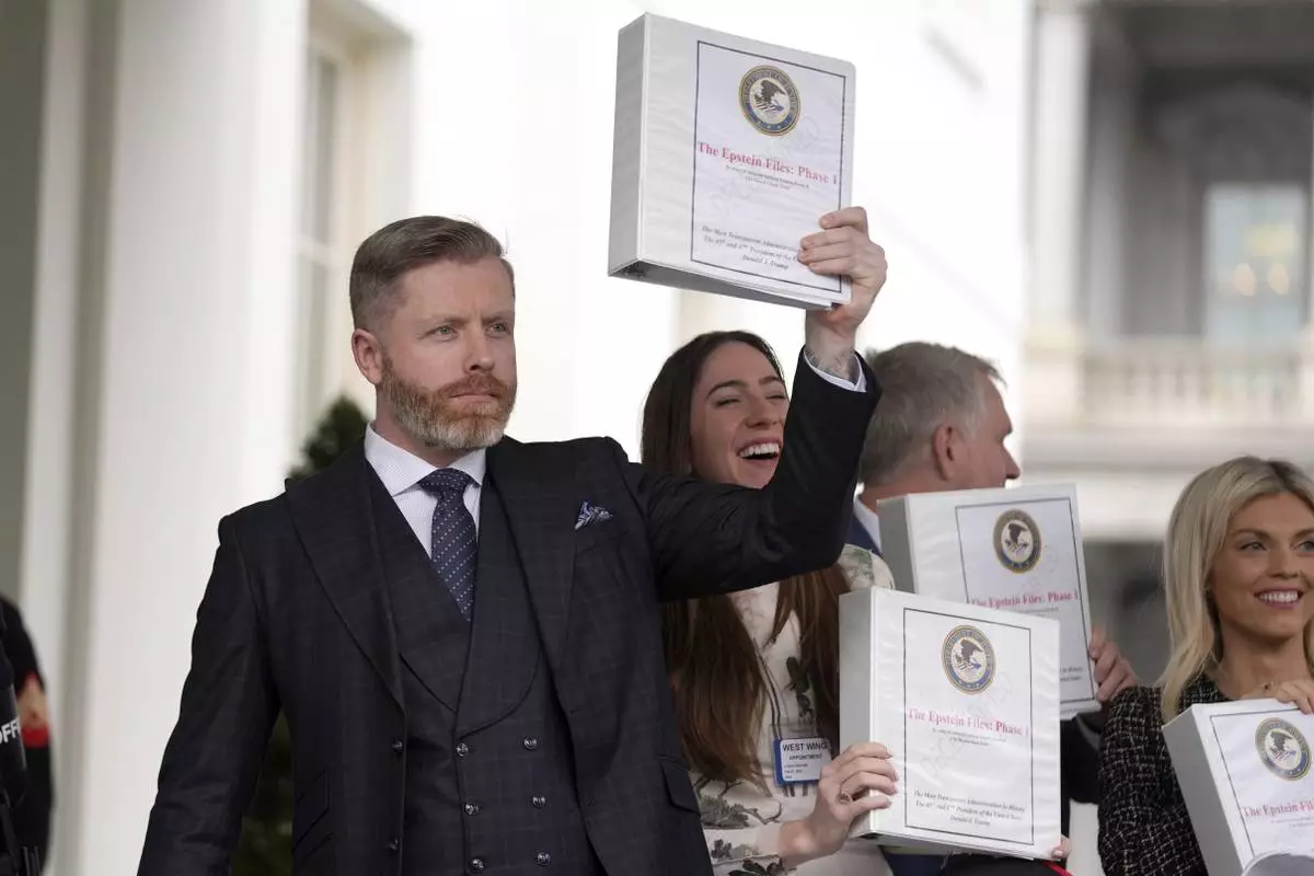 Conservative political commentator Rogan O'Handley, also known as DC Draino, from left, and social media content creator Chaya Raichik hold up binders with a cover titled "The Epstein Files: Phase 1" at the White House, Thursday, Feb. 27, 2025, in Washington. (AP Photo/Evan Vucci)