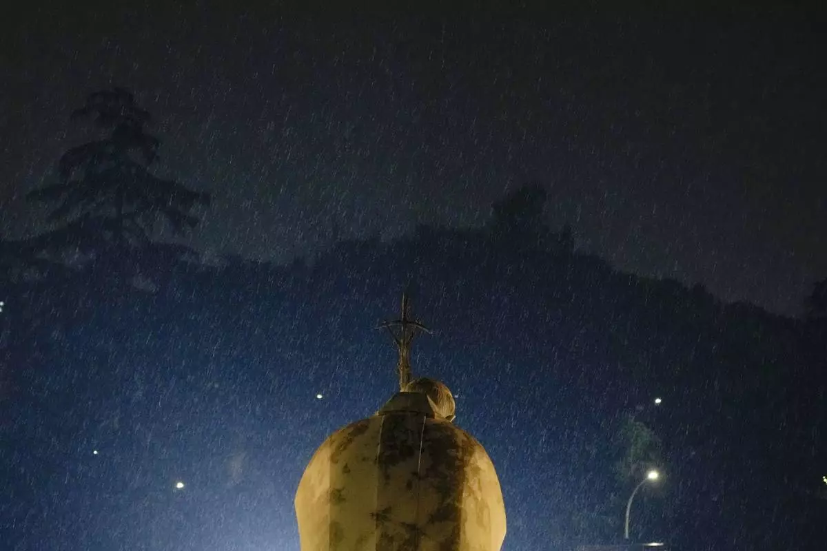 Rain falls over Pope John Paul II statue outside the Agostino Gemelli Polyclinic where Pope Francis is hospitalised in Rome, Monday, Feb. 24, 2025. (AP Photo/Gregorio Borgia)