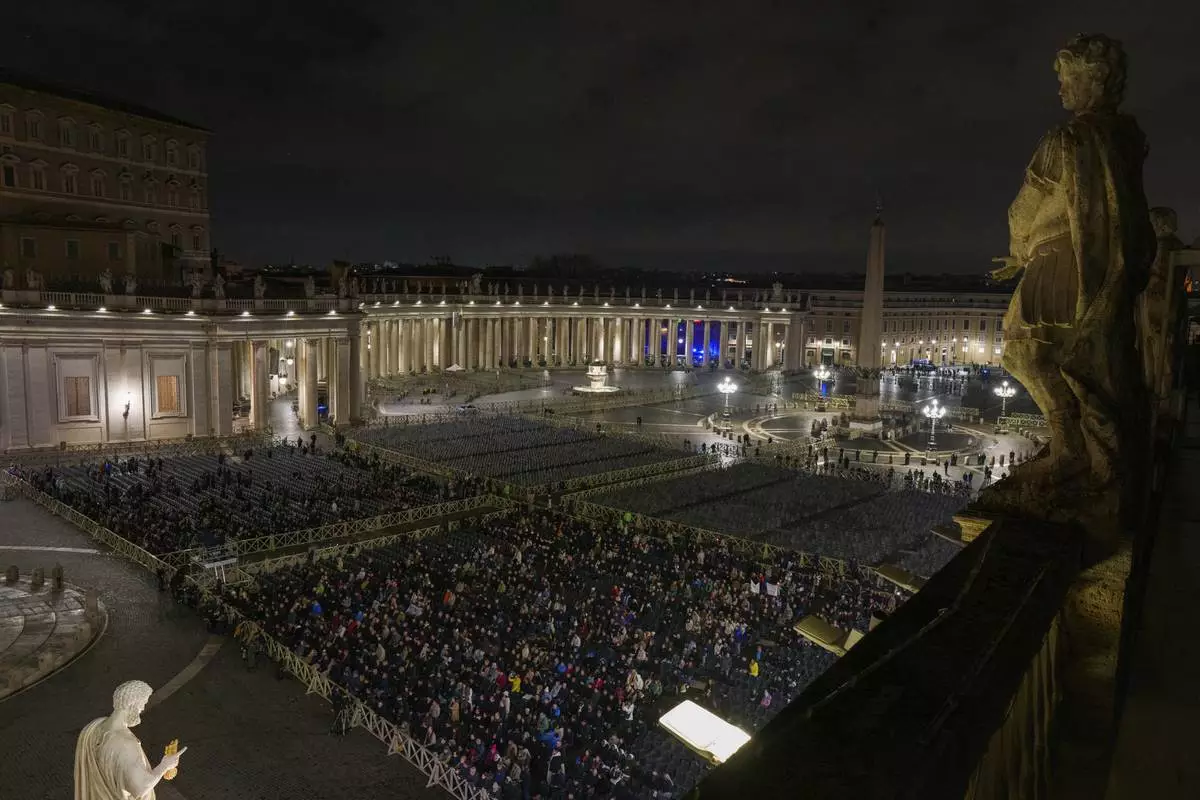 CORRECTS DAY Catholic faithful attend a nightly rosary prayer service for the health of Pope Francis in St. Peter's Square at the Vatican, Tuesday, Feb. 25, 2025. (AP Photo/Bernat Armangue)