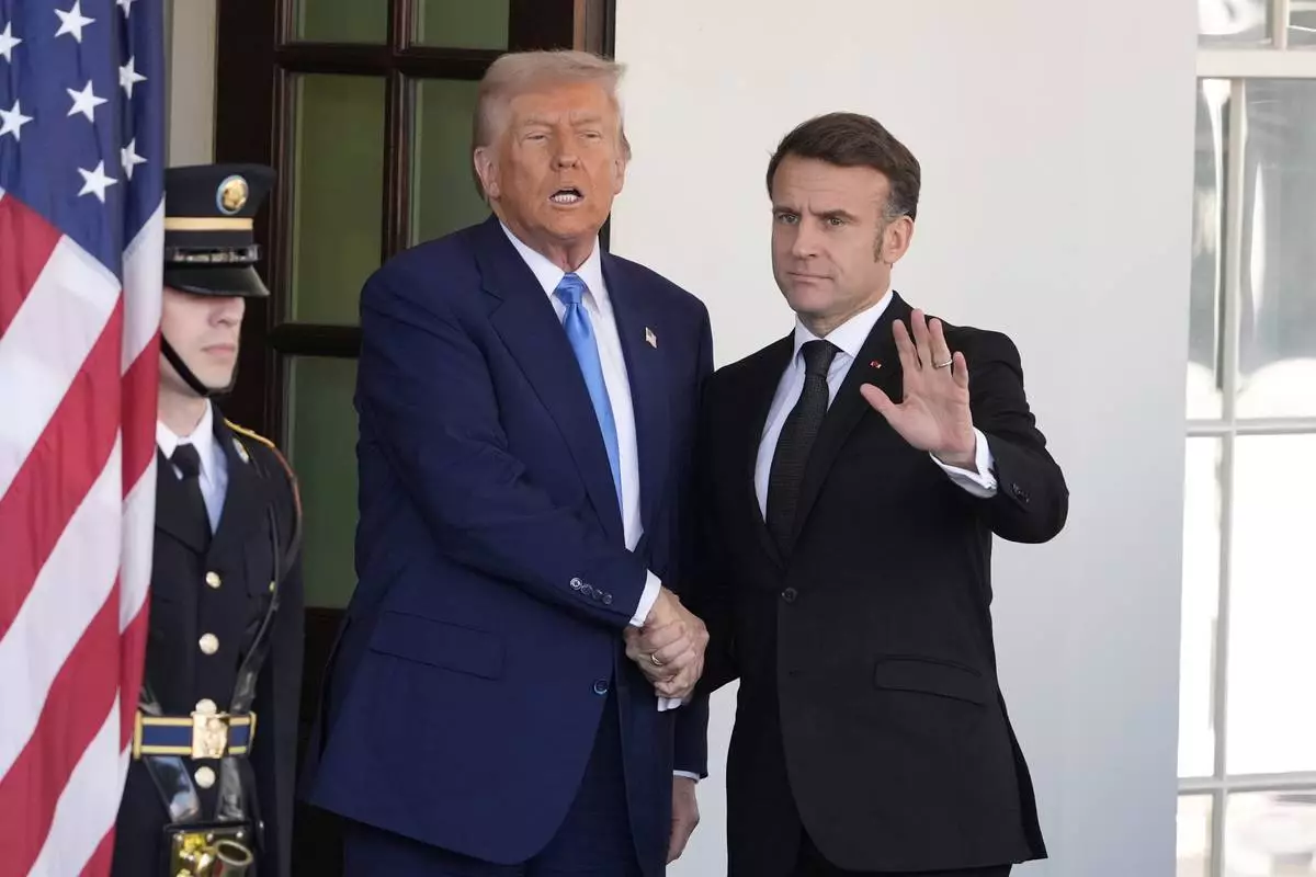 President Donald Trump speaks as he greets France's President Emmanuel Macron, right, before a news conference at the White House, Monday, Feb. 24, 2025, in Washington. (AP Photo/Manuel Balce Ceneta)
