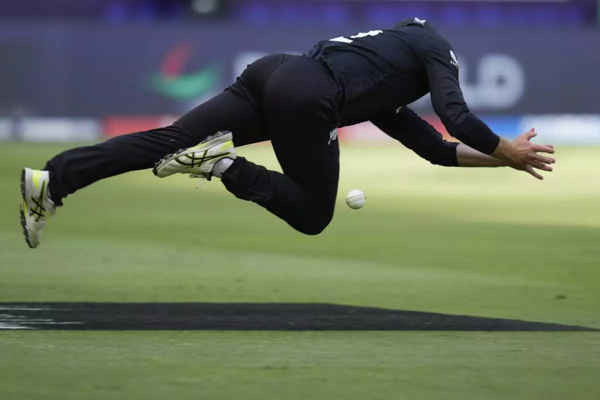 New Zealand's Will Young fails to take the catch after a shot played by India's Shreyas Iyer during the ICC Champions Trophy cricket match between India and New Zealand at Dubai International Cricket Stadium in Dubai, United Arab Emirates, Sunday, March 2, 2025. (AP Photo/Altaf Qadri)