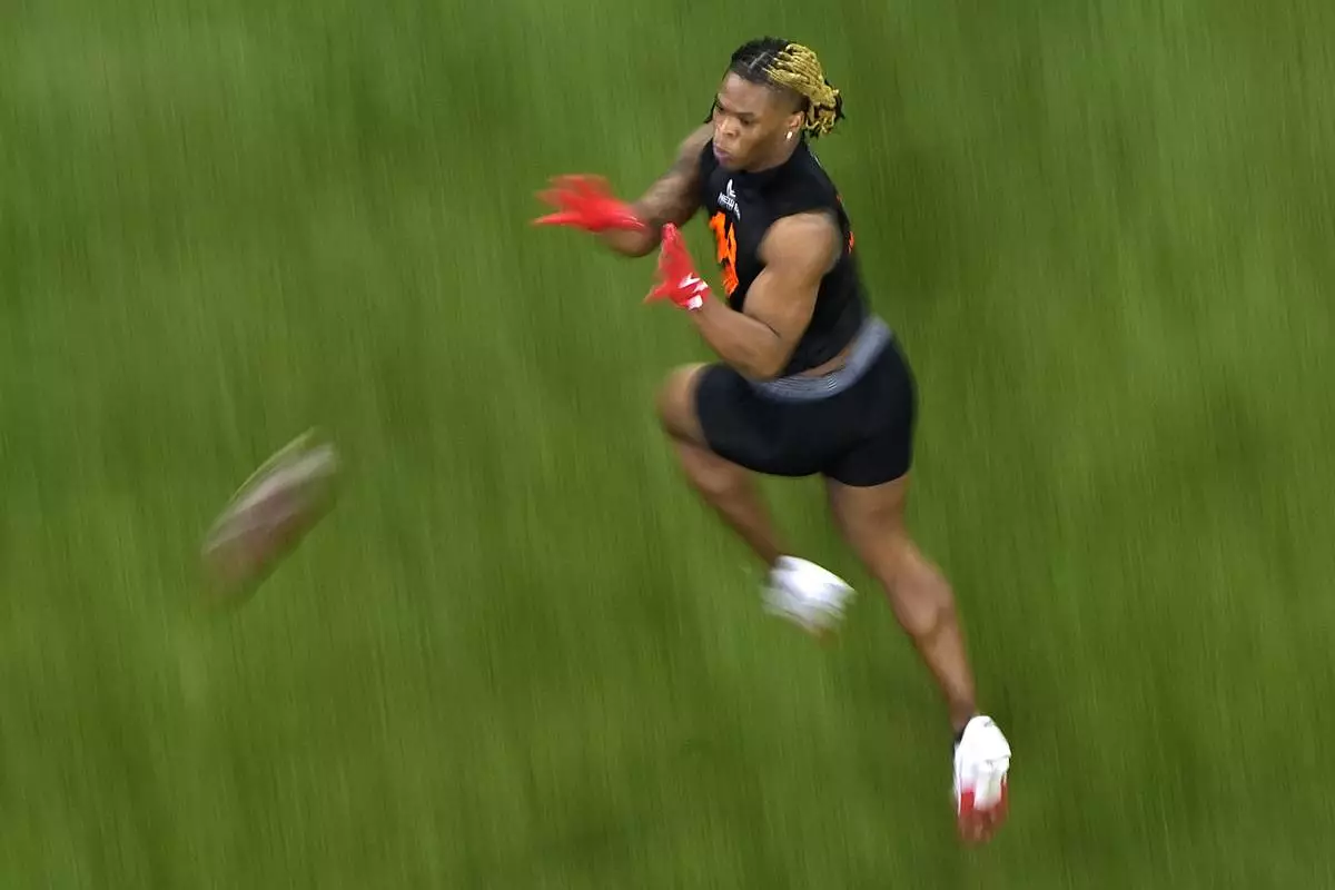 Ohio State running back Quinshon Judkins participates in a drill at the NFL football scouting combine, Saturday, March 1, 2025, in Indianapolis. (AP Photo/Charlie Riedel)