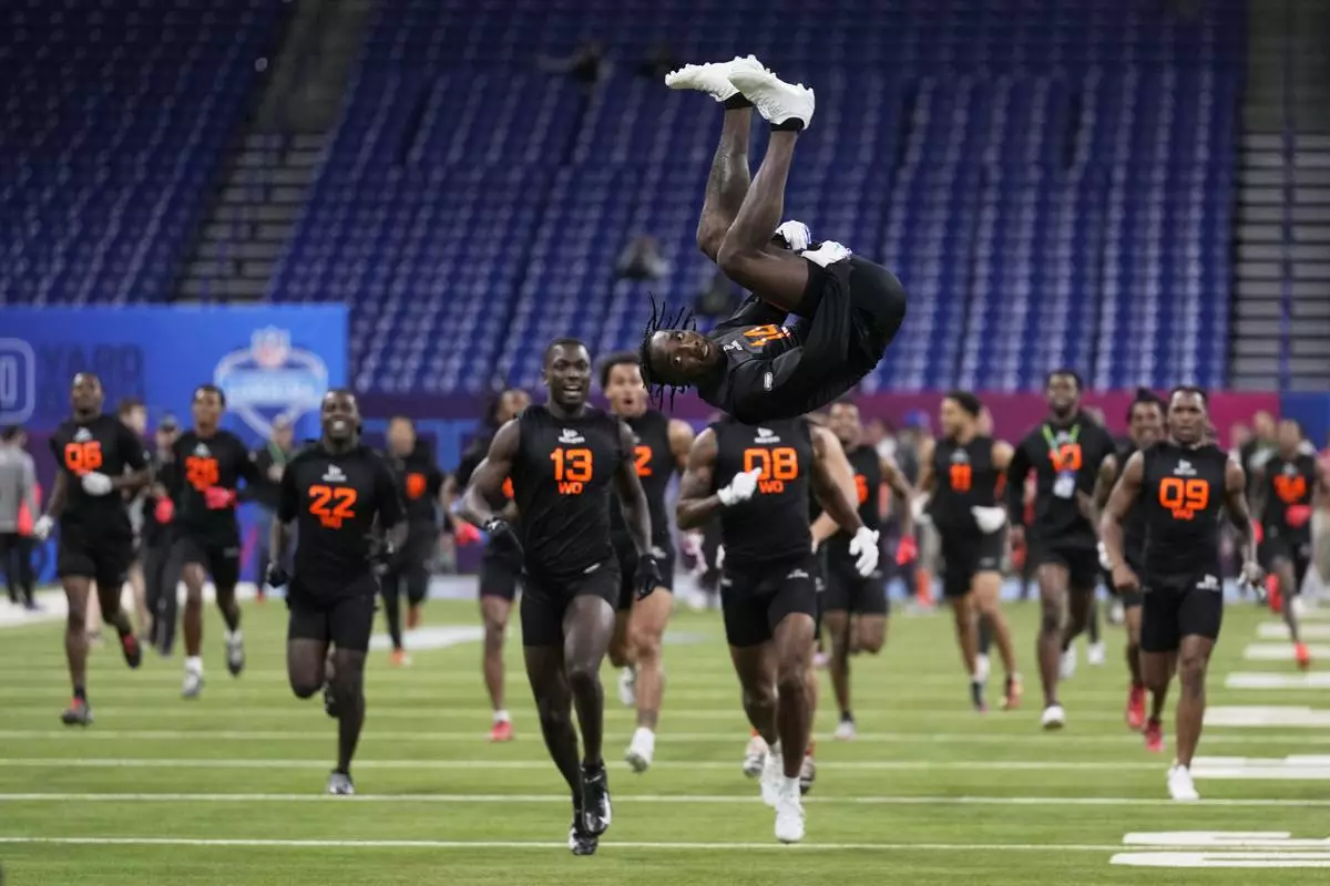 Maryland wide receiver Tai Felton does a backflip as wide receiver prospects run to the end zone to celebrate after running drills at the NFL football scouting combine in Indianapolis, Saturday, March 1, 2025. (AP Photo/George Walker IV)