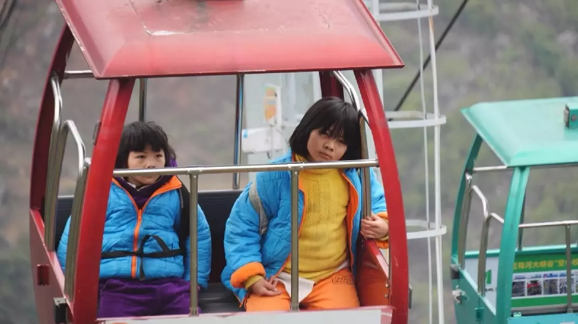 After a scenic train ride, they ascend a towering 268-meter-tall cliffside elevator, after which they then glide high above the Nizhuhe river canyon in a cable car, before finally reaching their school.