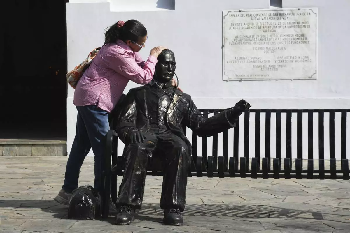 A man looks up at a statue of José Gregorio Hernandez, the physician known as the "doctor of the poor", in Valencia, Venezuela, Tuesday, Feb. 25, 2025. Pope Francis on Tuesday approved a decree to canonize Hernandez, making him Venezuela's first saint. (AP Photo/Jacinto Oliveros)