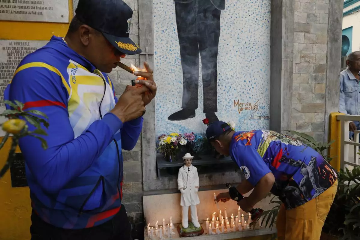 Devotees of folklore spiritual deity Maria Lionza smoke cigars in front the memorial dedicated to Dr. Jose Gregorio Hernandez, on the street where he died when hit by a car in 1919, in La Pastora neighborhood of Caracas, Venezuela, Tuesday, Feb. 25, 2025, after Pope Francis approved the canonization of the physician as Venezuela's first saint. (AP Photo/Cristian Hernandez)