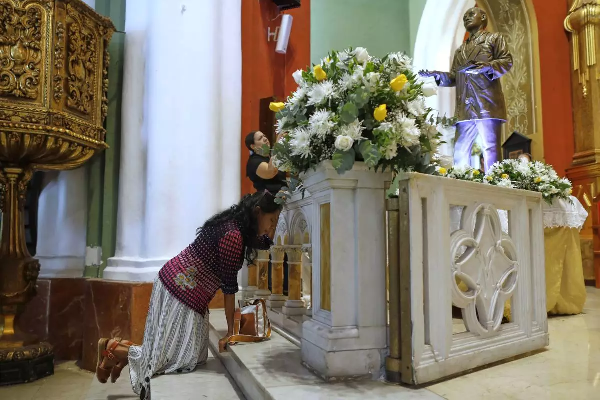 A woman kneels at the shrine dedicated to Dr. Jose Gregorio Hernandez, at a church in Caracas, Venezuela, Tuesday, Feb. 25, 2025, after Pope Francis approved the canonization of the physician known as the "doctor of the poor", making him Venezuela's first saint. (AP Photo/Cristian Hernandez)