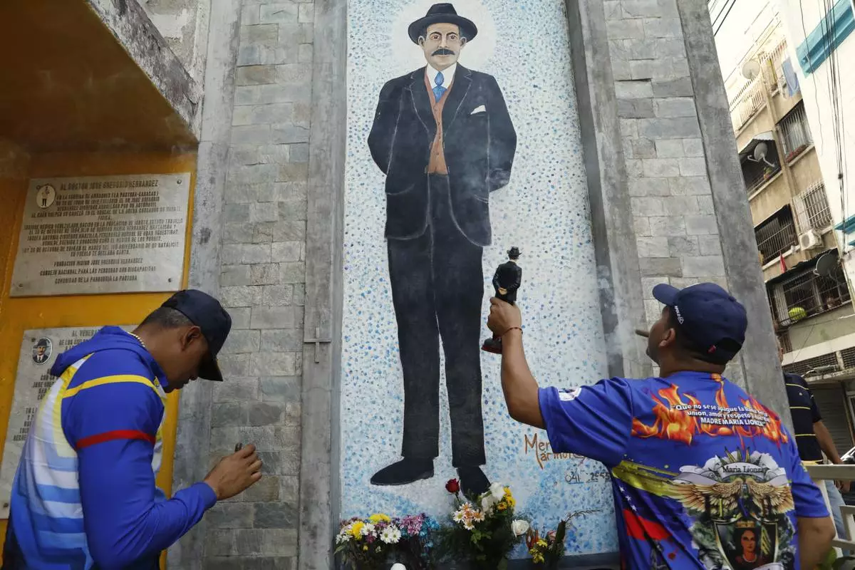 Devotees of folklore spiritual deity Maria Lionza visit the memorial dedicated to Dr. Jose Gregorio Hernandez, on the street where he died when hit by a car in 1919, in La Pastora neighborhood of Caracas, Venezuela, Tuesday, Feb. 25, 2025, after Pope Francis approved the canonization of the physician as Venezuela's first saint. (AP Photo/Cristian Hernandez)