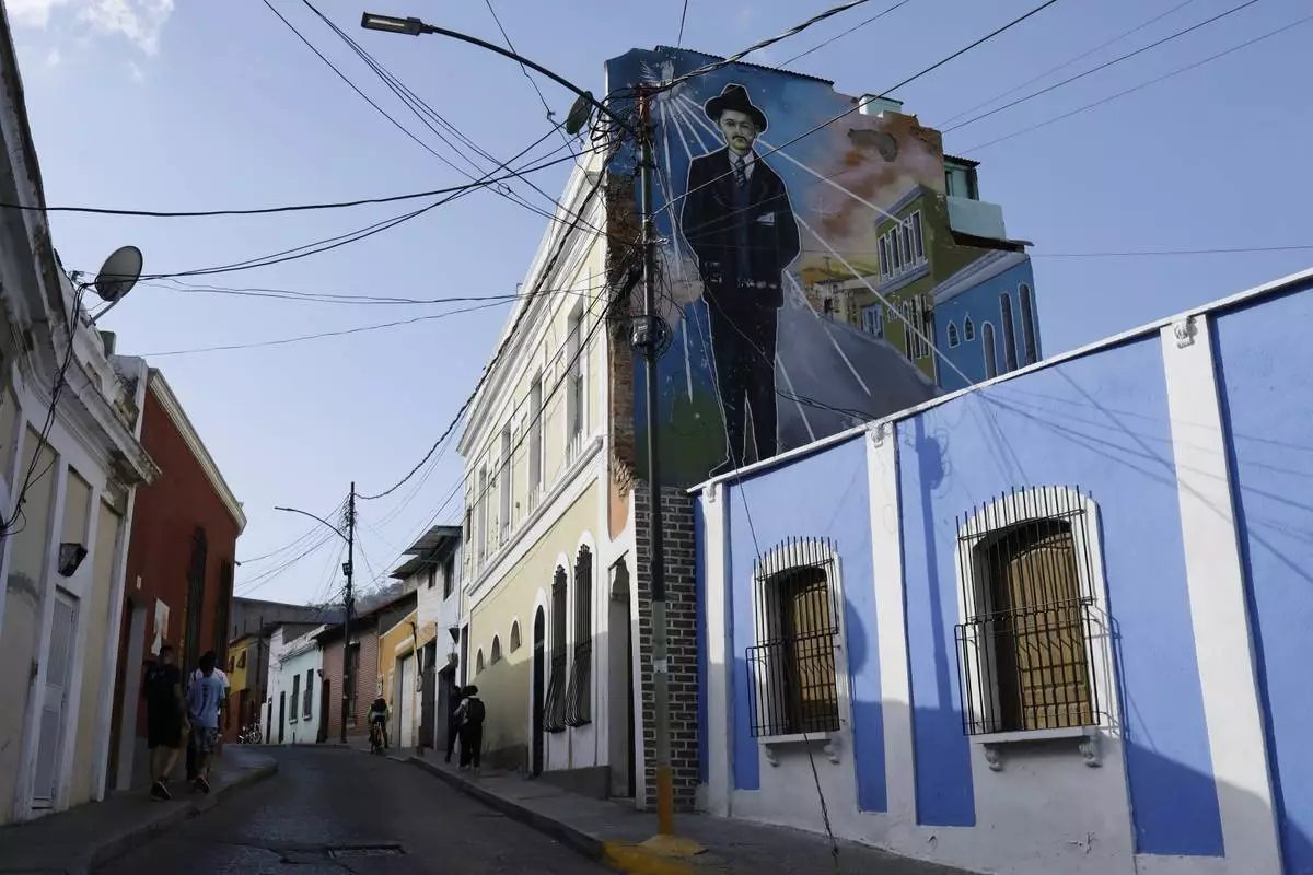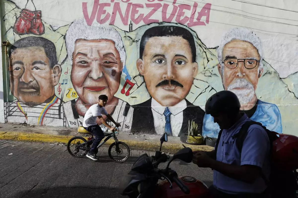 A cyclist rides past a mural depicting Dr. Jose Gregorio Hernandez, third from left, and other residents of La Pastora neighborhood in Caracas, Venezuela, after Pope Francis approved the canonization of the physician as Venezuela's first saint on Tuesday, Feb. 25, 2025. (AP Photo/Cristian Hernandez)