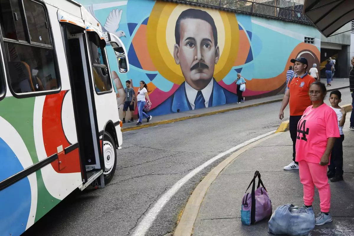 Commuters wait for transport next to a mural depicting Dr. Jose Gregorio Hernandez in La Pastora neighborhood of Caracas, Venezuela, after Pope Francis approved the canonization of the physician as Venezuela's first saint on Tuesday, Feb. 25, 2025. (AP Photo/Cristian Hernandez)