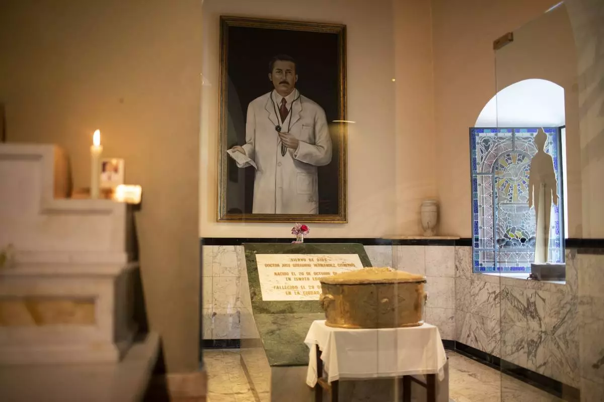 FILE - The remains of Dr. Jose Gregorio Hernandez, popularly known as the "doctor of the poor", are displayed in an urn backdropped by his portrait, inside the La Candelaria Catholic church, in Caracas, Venezuela, April 23, 2021. (AP Photo/Ariana Cubillos, File)