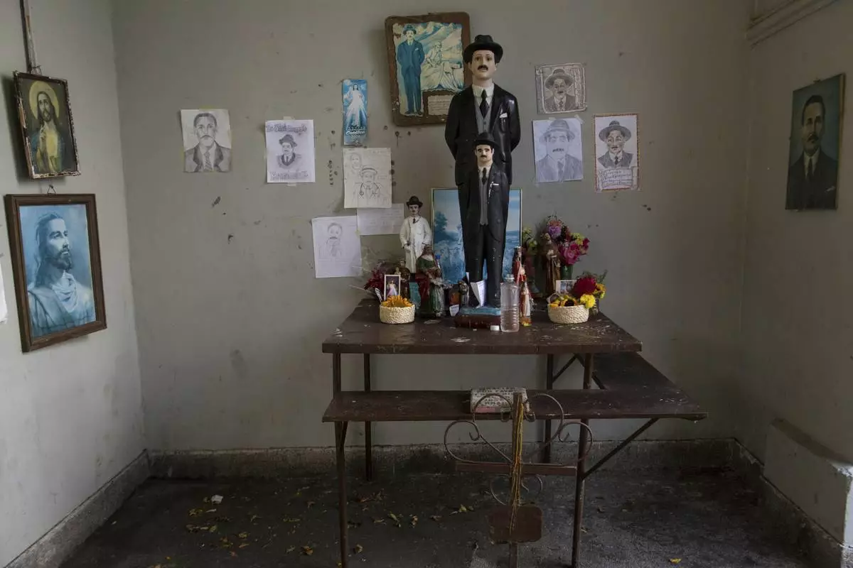 FILE - An altar dedicated to Dr. Jose Gregorio Hernandez is adorned with flowers and statues in his likeness, at the Vargas Public Hospital in Caracas, Venezuela, Feb. 5, 2019. (AP Photo/Rodrigo Abd, File)