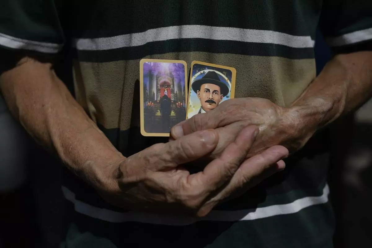FILE - A man holds prayer cards with images of Dr. Jose Gregorio Hernandez on the day of his beatification ceremony outside the church that guards his remains in La Candelaria neighborhood of Caracas, Venezuela, April 30, 2021. (AP Photo/Matias Delacroix, File)
